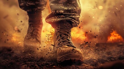 military combat boots with explosive battlefield in background dramatic war concept digital illustration