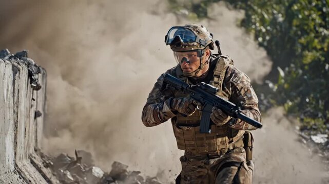 Soldier in tactical gear running past an explosion with debris and dust flying in a combat zone or training exercise