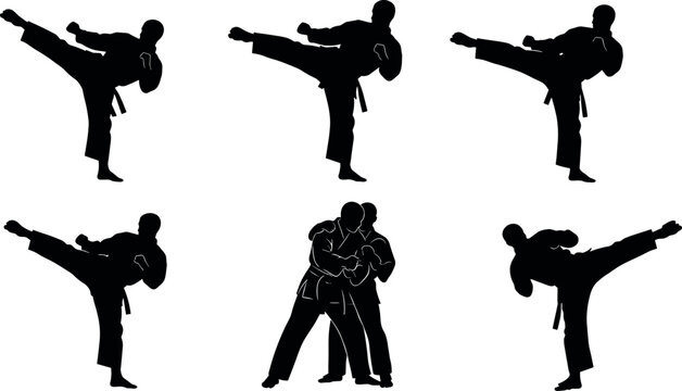 Martial arts silhouette set featuring high kicks and grappling techniques for combat training, fitness, self-defense, and sports illustration use