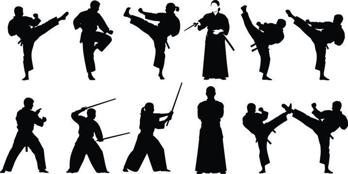 Martial arts silhouette vector set, combat poses illustration, sword techniques clipart, fighter stances graphic, black karate icons, discipline motion