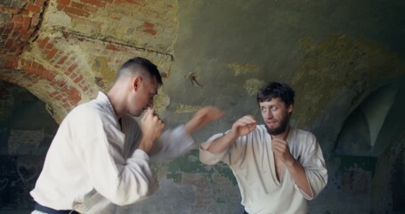 Boy in kimono practices combat technique of punching and blocking with trainer at family martial arts class