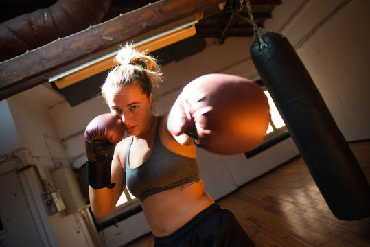Attractive young sportswoman at boxing training session. Woman in sport clothes standing at gym in combative position, punching at camera. Sport, healthy lifestyle, boxing concept