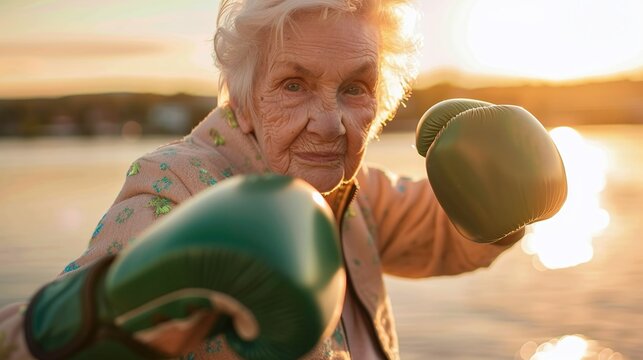 Irish grandmother wearing green boxing gloves, strong and determined, positive and dynamic, showing fists, ready to fight - Active senior lifestyle concept : Sunset of life in colors