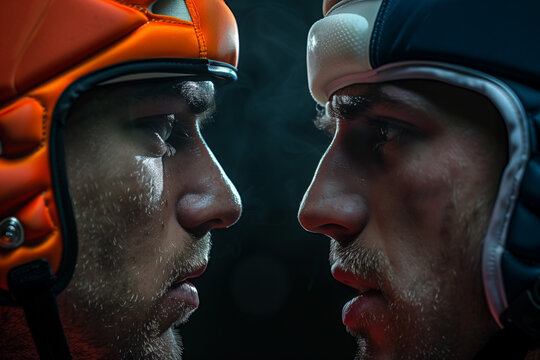 Intense close-up of two male ice hockey players in helmets confronting each other, with space for text, capturing the competitive spirit of the sport