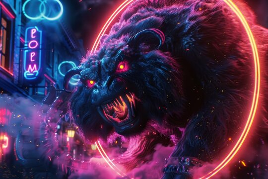 Prehistoric beast turned modern gladiator, encircled by vibrant neon fight signs
