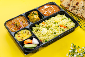 Indian mini meal parcel platter or combo thali with Gobi Masala, roti, dal tarka, jeera rice, salad