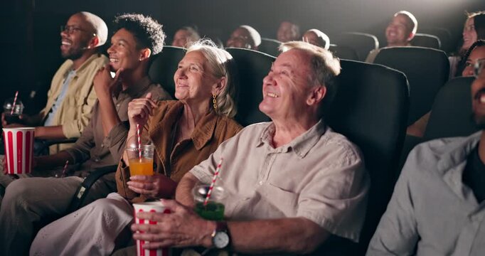 Diversity, people and laugh for comedy in theatre with movie for fun, enjoy and joke for entertainment. Audience, crowd and cinema for premier or watch show with drama, action and happy with popcorn