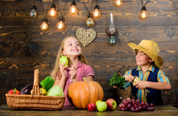 Farm market. Children presenting farm harvest wooden background. Kids farmers girl boy vegetables harvest. Farming teaches kids where their food comes from. Siblings having fun. Family farm
