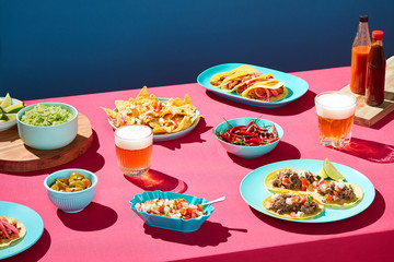 Party table with beer and Mexican food