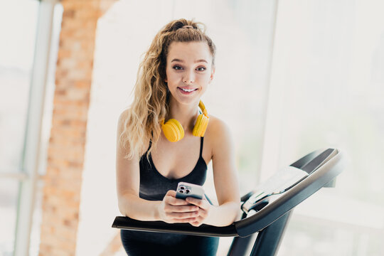 Active young woman with yellow headphones using smartphone on treadmill in gym, showcasing fitness, energy, and modern lifestyle.