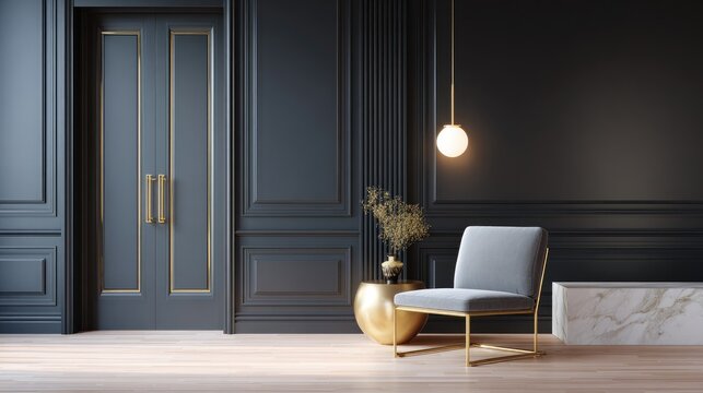Modern interior design featuring elegant chair, stylish lighting, dark wall, decorative vase, and minimalist decor elements for contemporary living spaces