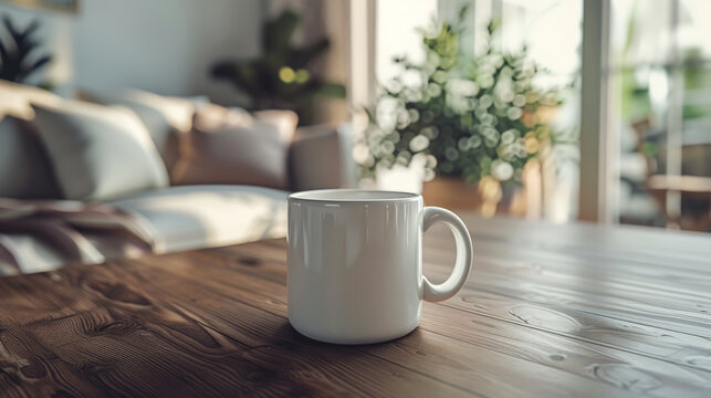 Minimalistic coffee mug setup on a wooden home table.