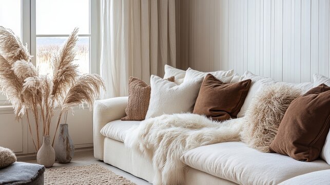 Sunlit living room with a cozy sofa and soft textures evoking comfort and relaxation in a modern nature inspired and stylish home setting