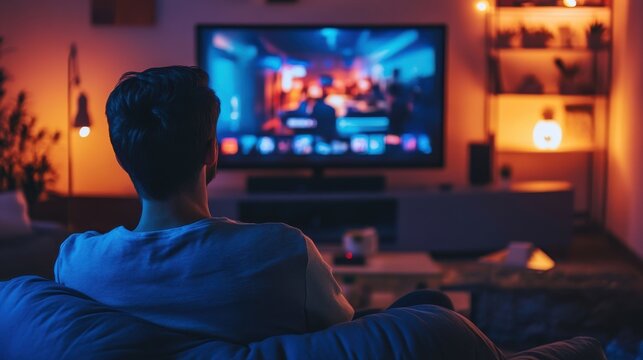 Cozy Home Entertainment: Person Sitting on Bean Bag Chair Streaming TV Show in Warmly Lit Living Room with Flat-Screen TV