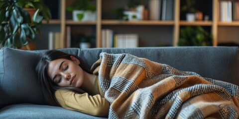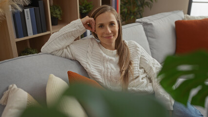 Woman relaxing on a comfortable sofa in a cozy living room setting, surrounded by warm decor and plants, exuding a calm and inviting atmosphere.