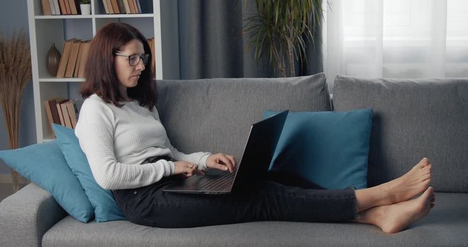 Side view of mature woman in domestic clothing lying on comfortable couch and using laptop. Smart lady in eyewear working remotely at home