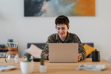 A smiling young person works remotely on a laptop at a wooden table. They wear earbuds and a plaid shirt, enjoying a comfortable home office setup with coffee.