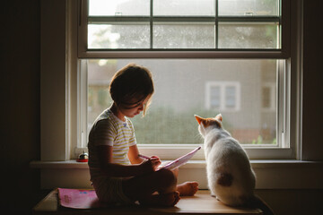 A little girl and her cat sit together peacefully on a window bench