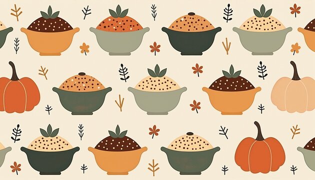 Repeating autumn harvest pattern with pumpkins and bowls in muted warm colors representing cozy fall themes