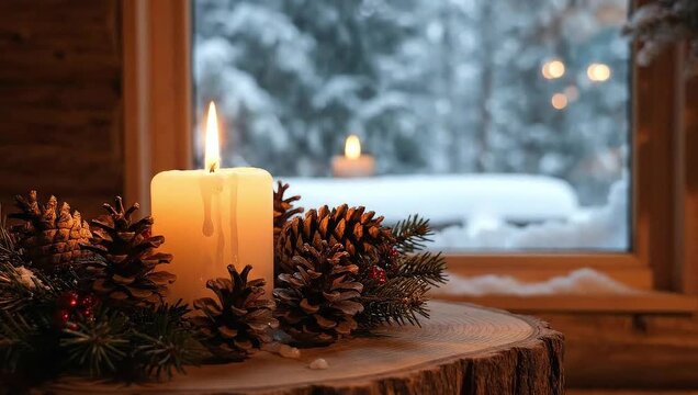 Cozy winter scene with lit candle and pinecones on wooden table by snowy window