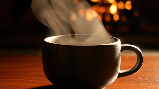 A dark mug of hot coffee with rising steam sits on a wooden table, creating a warm and comforting scene.