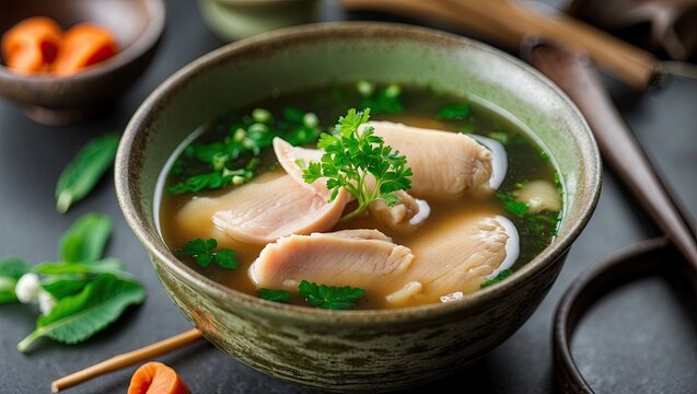 Ginseng chicken soup in a green bowl on a dark surface, garnished with herbs and surrounded by ingredients, with ample copy space for text design.