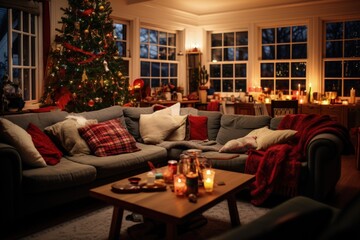 Festive Living Room Setting for a Cozy Christmas Party, Ambience, Holiday Decorations in Inviting Home