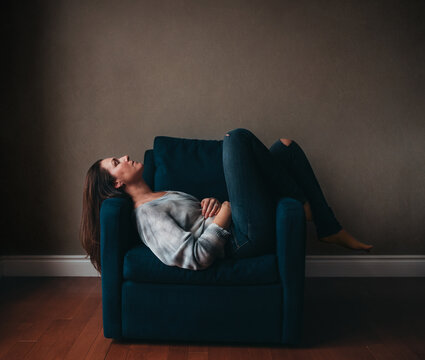 Attractive woman resting in a comfortable chair in an empty room.