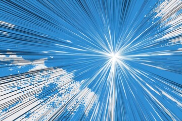 Anime-inspired explosion backdrop with vibrant radial lines - energetic starburst effect ideal for manga fans and comic book artwork. Exciting blue and white halftone design for dynamic storytelling