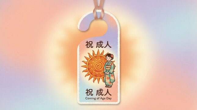 decorative door hanger template for coming of age day japan illustration template featuring young figure standing beside large stylised sun on soft gradient background with gentle glow