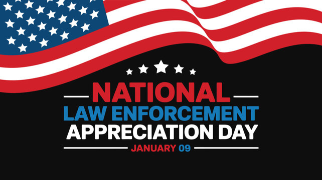 National Law Enforcement Appreciation Day Banner with US Flag and Stars on Black Background for January 9 Police Officer Tribute