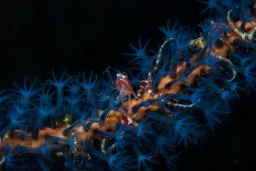 Emperor shrimp, Periclimenes imperator, and commensal crab, Lissocarcinus orbicularis, living on a leopard sea cucumber, Sulawesi Indonesia.