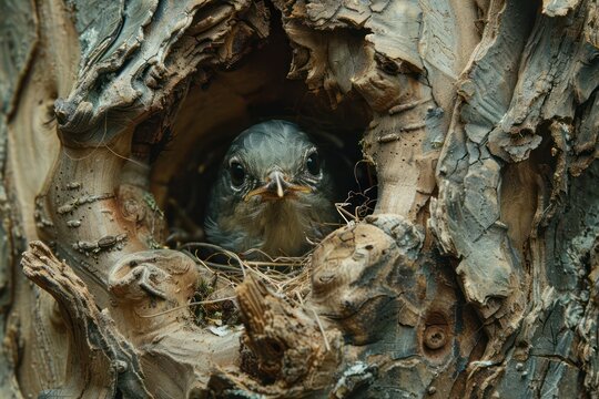 Detail a bird nesting in a tree, focusing on the commensal relationship where the bird benefits from the shelter without affecting the tree