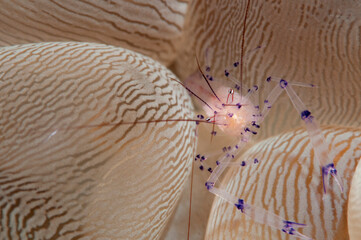 Dancing ocellaris clownfish and tosa commensal shrimp on closed anemone,Bali, Indonesia