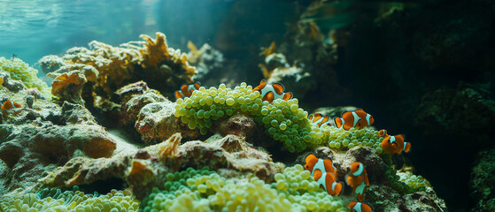 AI generator images of Clownfish looking for plankton and food near sea grapes or green cavier seaweed on the coast of sea, ocean