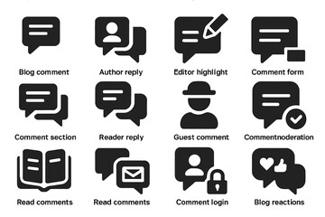 Blog Comment Icons. Solid style icons of article and blog comments: blog comment, author reply, editor highlight, comment form,
