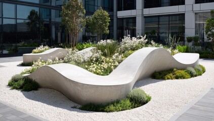 Serpentine concrete bench in city courtyard garden for commercial buildings