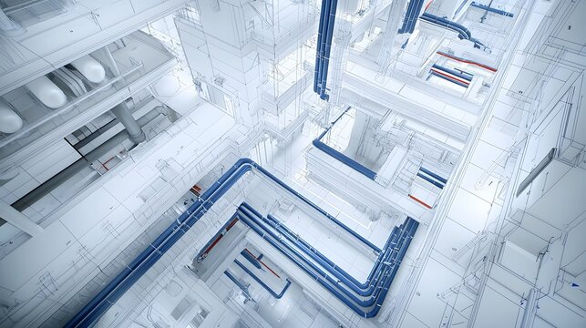 isometric blueprint diagram showcasing the detailed pipe layout and integrated infrastructure of a multi story commercial office building  The intricate design includes the complex system of plumbing