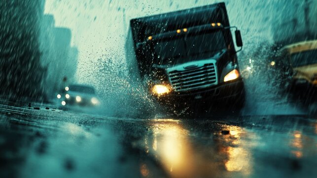 Truck driving in heavy rain, city background, water splashes, transport safety