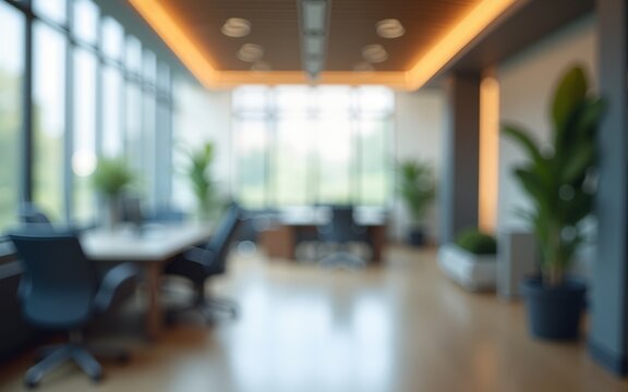 Abstract office interior background. Blurry office space. Modern workspace design. Glass walls, blurred furniture, plants. Natural light, commercial building, business concept, indoor. High quality