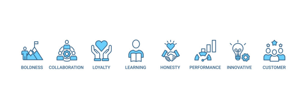 Company values banner web icon set vector illustration concept with icon of honesty, boldness, collaboration, customer loyalty, learning, performance, innovative, trust icons live stroke editable