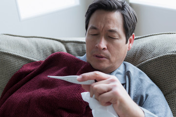 one senior man sit on sofa bed hold Paper tissue common cold sneezing
