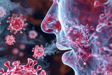 The common cold is visualized by a cluster of rhinovirus particles invading respiratory tissues, displaying the ubiquitous ailment, close up hitech concept