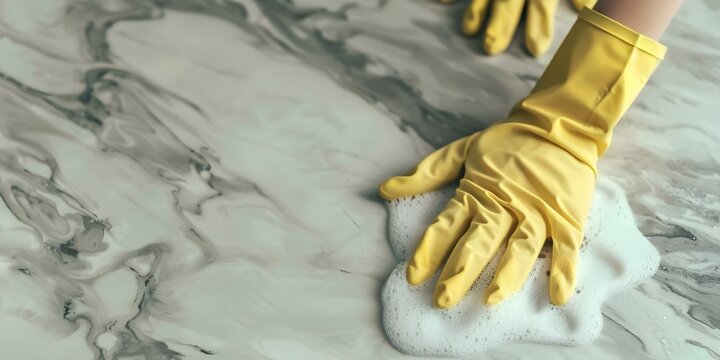 Hand in yellow glove cleaning surface for hygiene and cleanliness