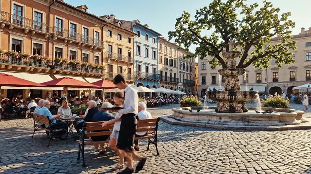 Outdoor cafe patrons enjoy beverages in a sunlit european town square with a waiter serving