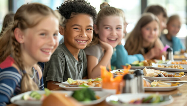 showing kids enjoying a communal meal in the camp dining hall, chatting and laughing together at long tables, fostering friendships and community, school, summer camp, kids, Fun, w