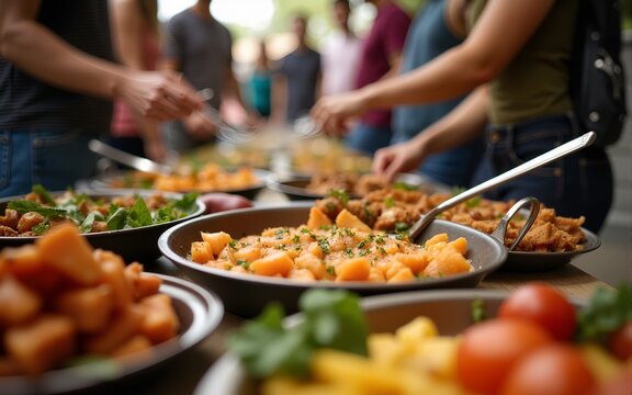 Detailed shot of people gathered for a community potluck. High quality