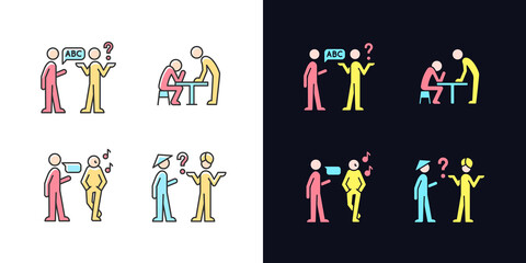 Communicating information effectively light and dark theme RGB color icons set. Language, cultural barriers. Isolated vector illustrations on white and black space. Simple filled line drawings pack