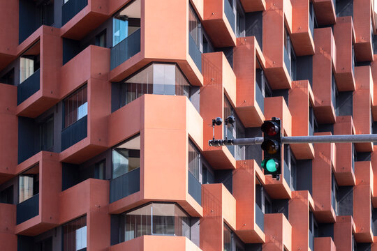 A green traffic light signals clear direction beside a uniquely designed building facade, showcasing the harmony between urban infrastructure and architectural creativity.