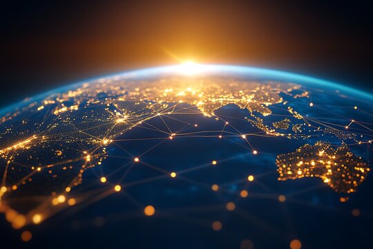 global connectivity showing digital networks and data flow across the Earth. The image highlights the interconnected nature of modern technology with vibrant lines representing the speed